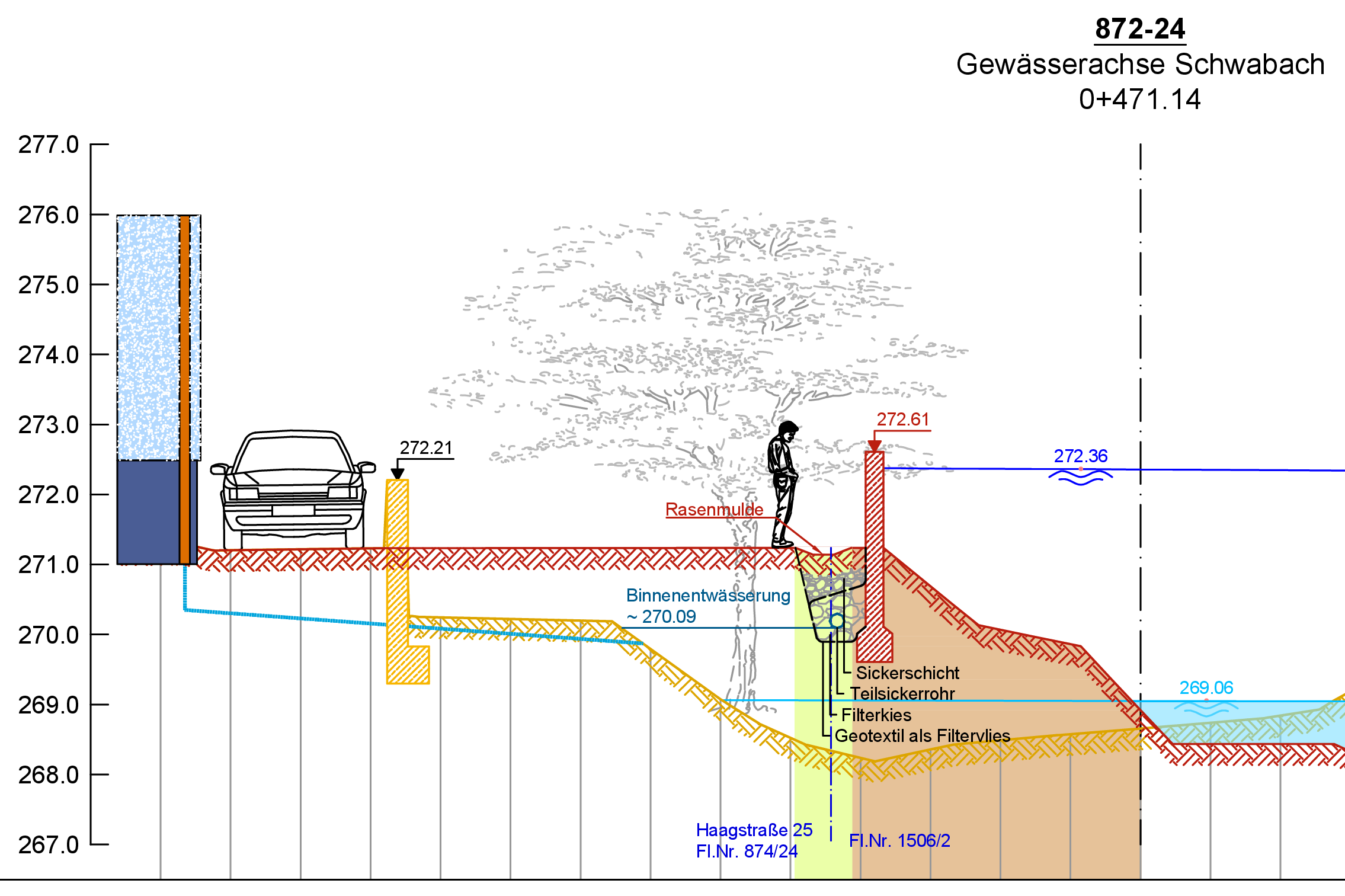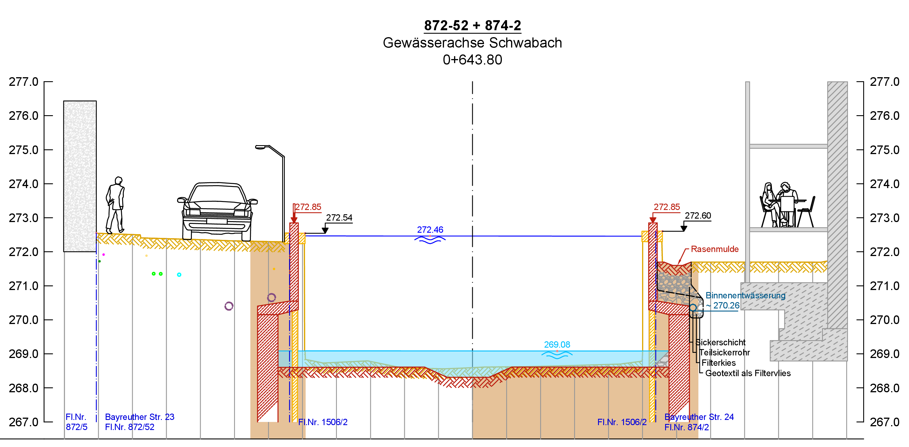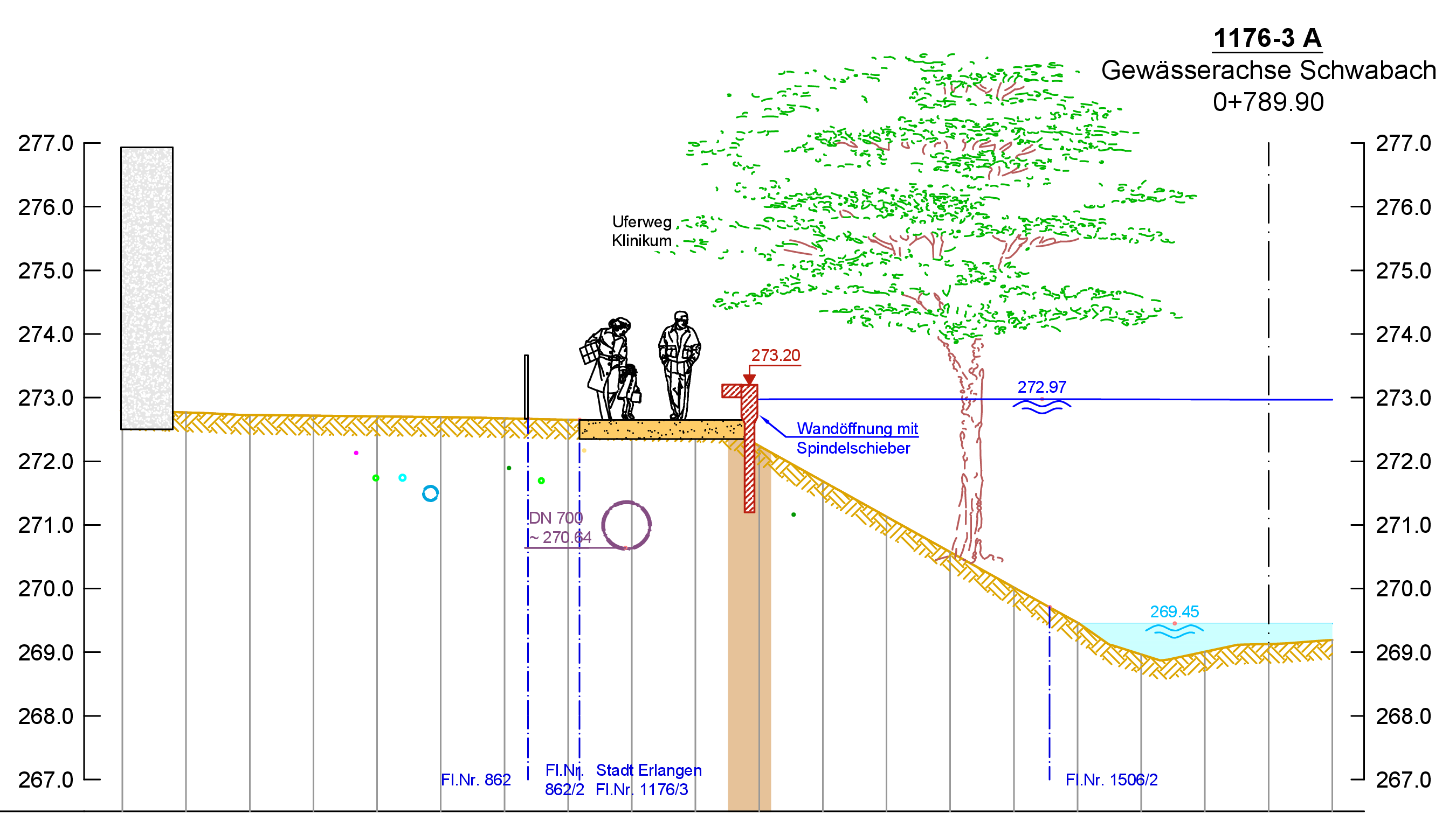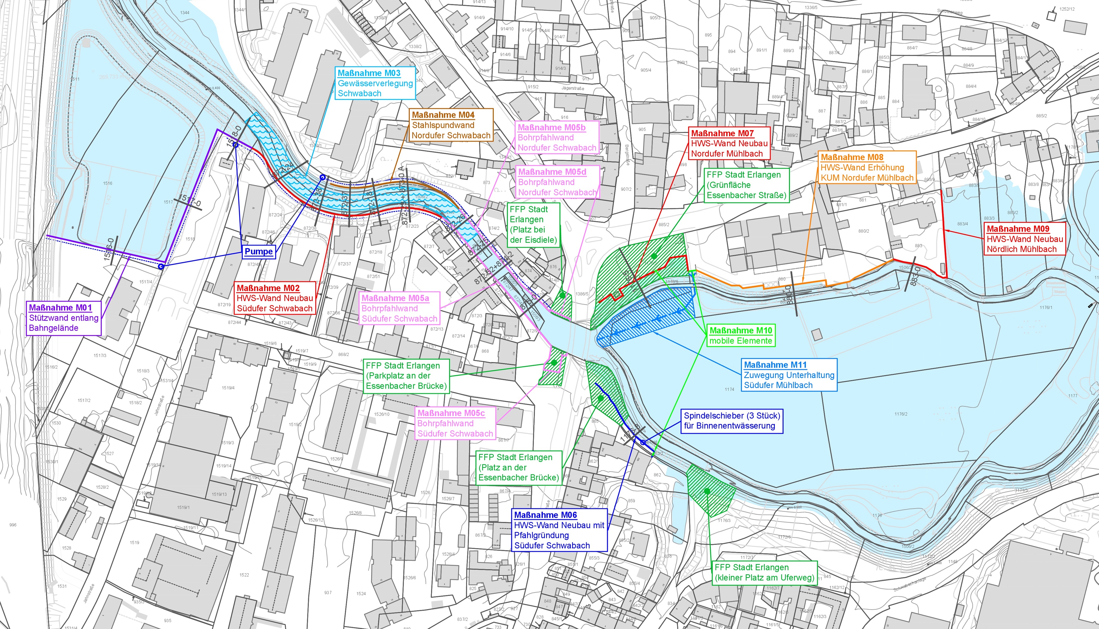 Neben der bereits bestehenden Stützmauer aus Stahlbeton wird eine neue Hochwasserschutzwand (HWS) in der erforderlichen Höhe geplant. Nach Errichtung dieser Wand wird die bestehende Mauer rückgebaut. Die neue Hochwasserschutzwand wird parallel zur Schwabach bis zum Anschluss an die neue Bohrpfahlwand fortgeführt und ist als Stahlbetonmauer geplant.