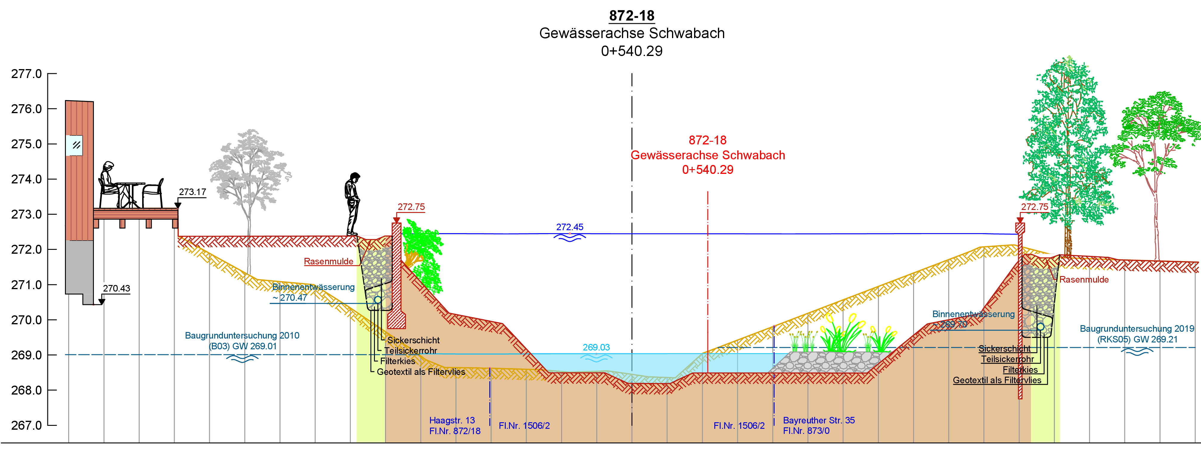 Beginnend am Bahndamm wird eine Hochwasserschutzwand errichtet, welche als Stützmauer aus Stahlbeton geplant ist.