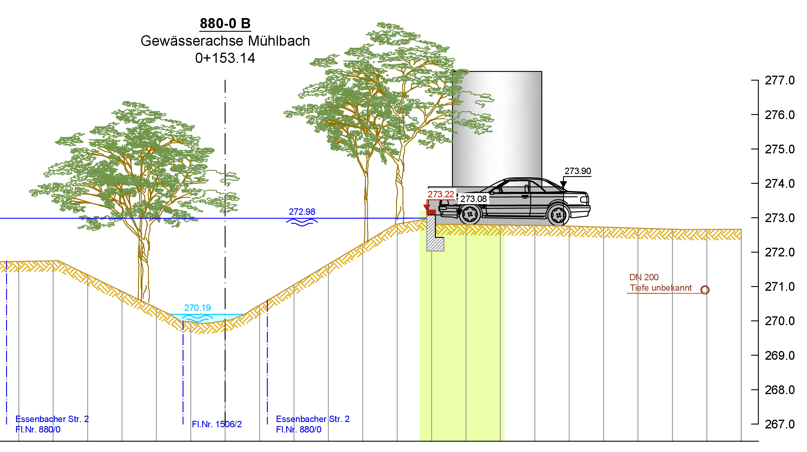 Die vorhandene Mauer am Nordufer des Mühlbachs reicht gerade nicht mehr aus, um das Bemessungshochwasser zurückzuhalten. Es ist daher geplant, diese Mauer geringfügig im Bestand zu erhöhen. Dadurch wird auch der erforderliche Freibord, also der Abstand zwischen Oberkante Mauer und Wasserspiegel, eingehalten.